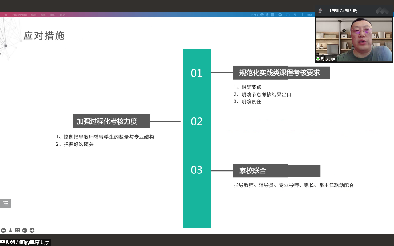 会上,计算机系主任朝力萌老师围绕计算机系实践类课程的课程体系、开设时序、过程化评价实施要求、存在问题作了详细讲解,最后就毕业设计过程中存在问题和应对措施和老师们进行了充分的交流。